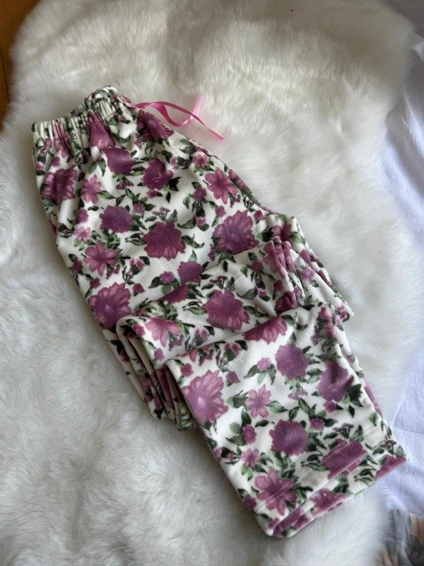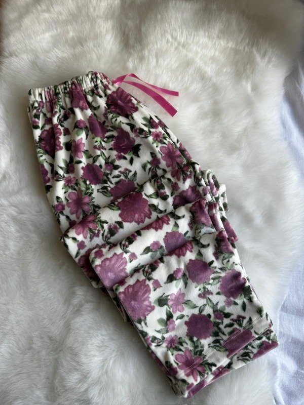 Pantalon Plush Blanco Flores Rosas