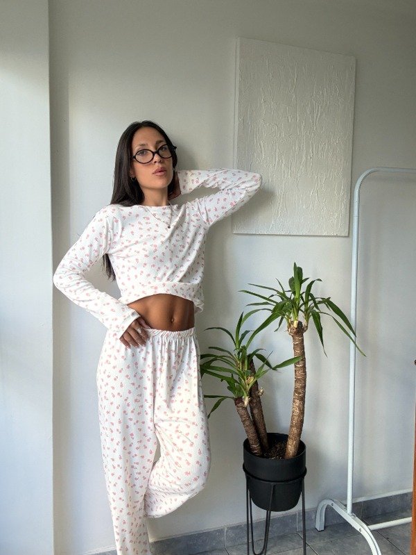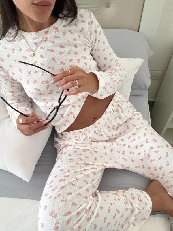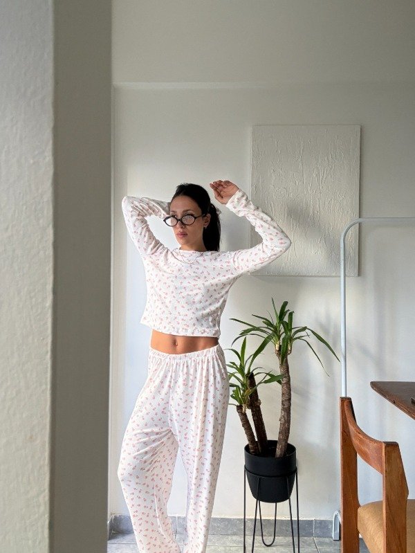Conjunto de Pijama Rattier Algodon Extra Calidad Blanco con Margaritas Rosadas